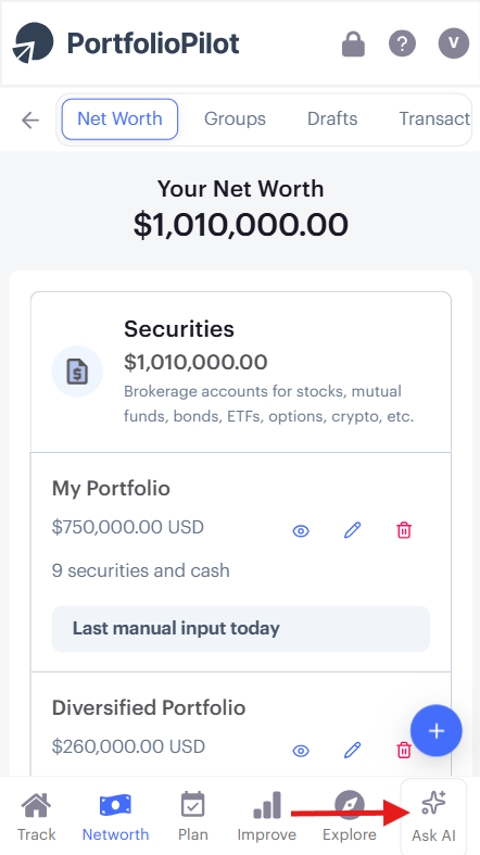 You can access the AI Assistant from anywhere inside PortfolioPilot. The interface works slightly differently on desktop and mobile devices.