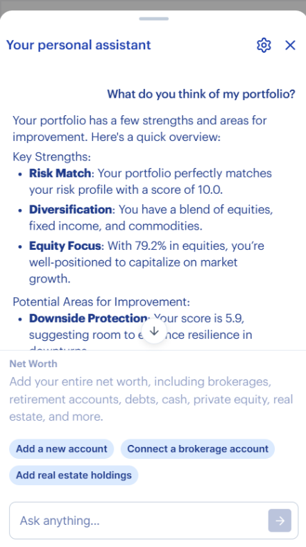 Because the Assistant has context about your holdings, allocations, retirement plan, and preferences, you can ask complex, personalized questions in natural language and receive answers grounded in your financial profile.